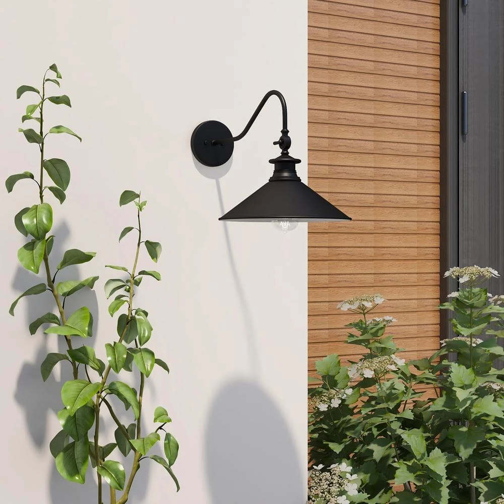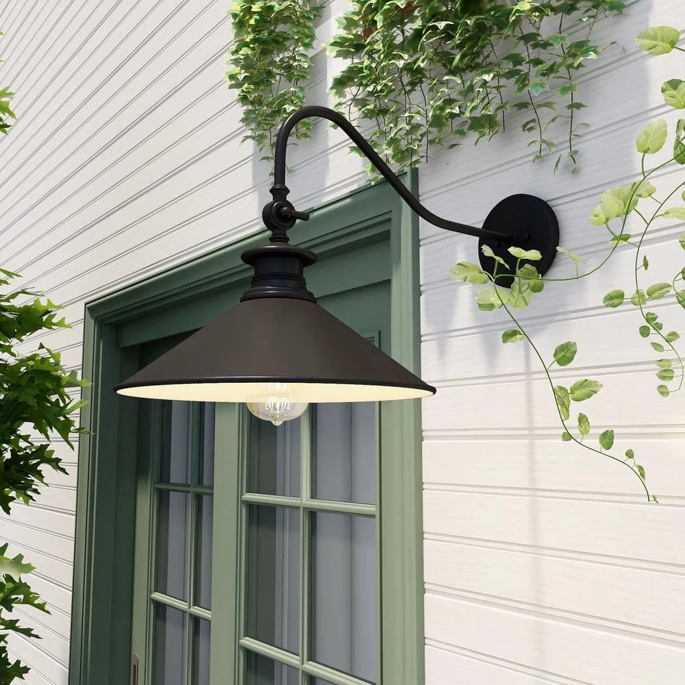 This classic light fixture brings any room together. It’s simple, understated design is sophisticated and refined. This 1 light wall sconce exudes plenty of country farmhouse charm with its wide barn style shade, allowing for plenty of downlighting to illuminate your home address, doorway, entryway, garage, outdoor living room, porch, or outdoor paths.