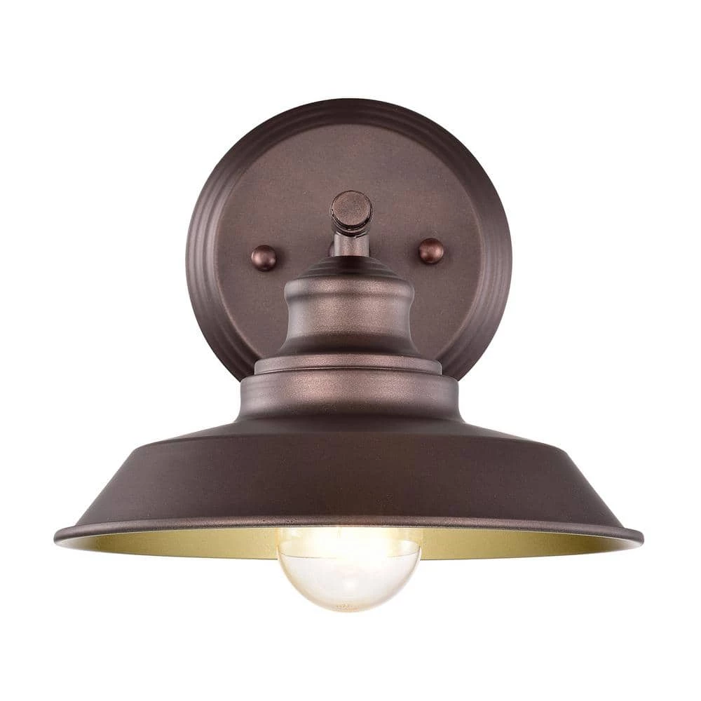 The industrial-style Wall Fixture adds vintage character to any decor, from modern to farmhouse. Oil rubbed bronze finish. the inside of the shade creates a reflective 2-tone appearance and enhances the soft warm glow of this wall fixture. Add a charming touch in the bathroom, over a vanity or in a bedroom.