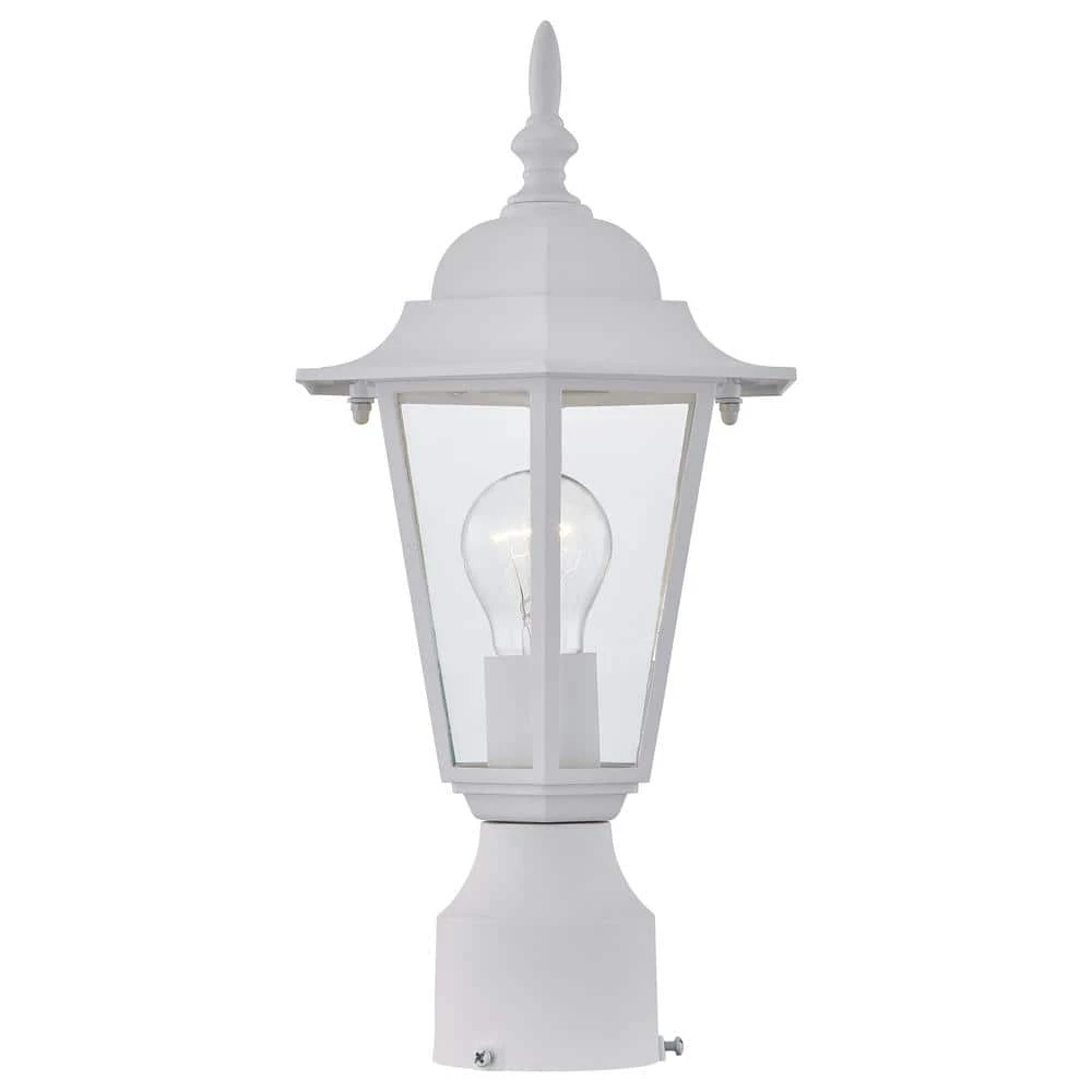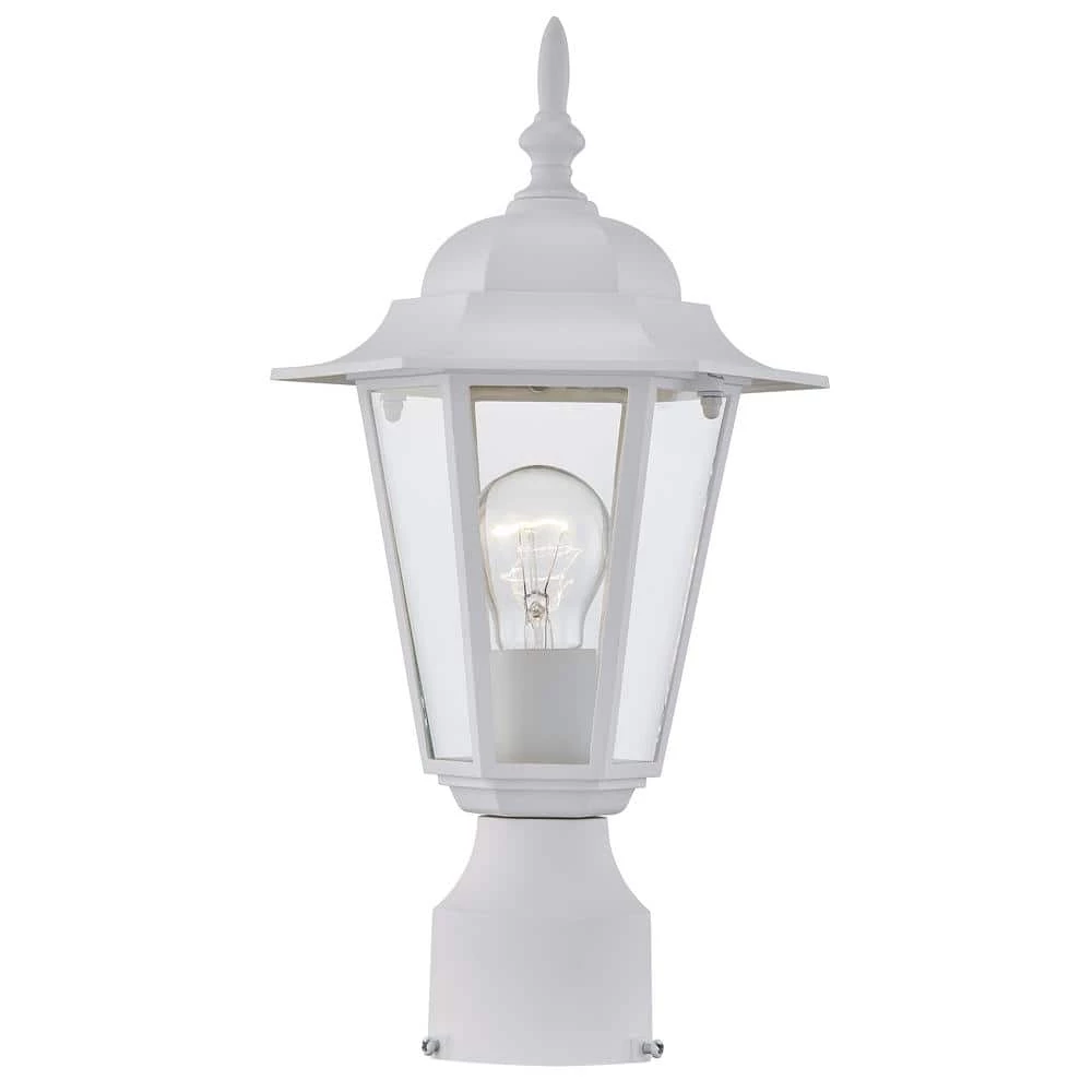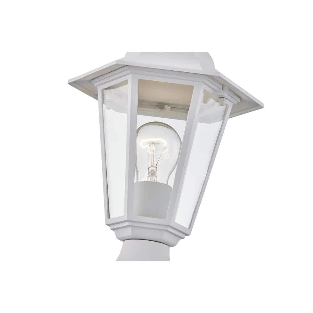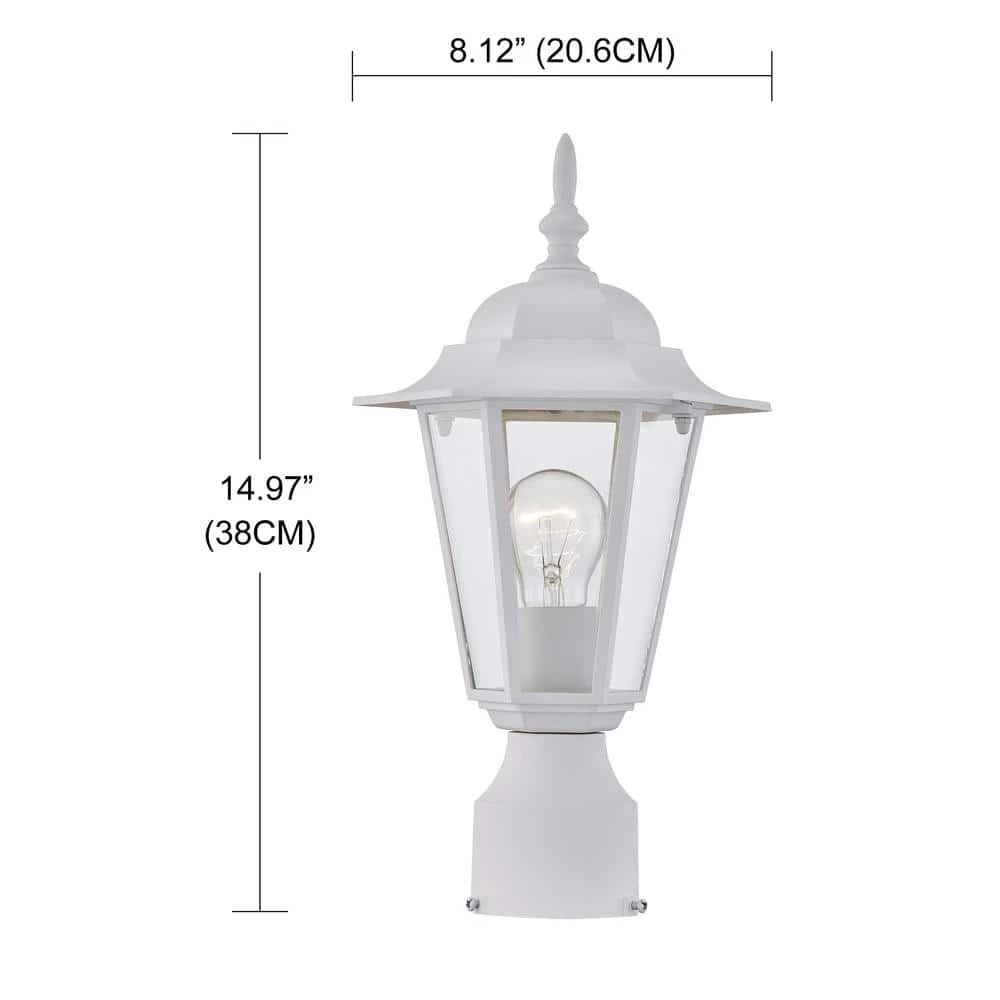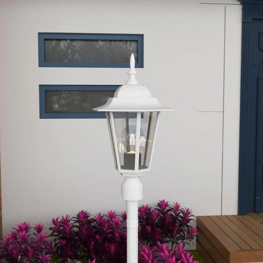 Classic decoration for the outside of any home. This Aluminum Post Lamp features an antique, Victorian-inspired design. Made of cast aluminum, this white post lamp with clear glass panels brightens up driveways and pathways. This light post is efficiently designed for exterior wet installations with weather-resistant, rust-resistant cast aluminum textured with a white finish. Weather-resistant and rust-resistant, this exterior post light fixture features sturdy metal construction and clear glass shade, suitable for wet locations.