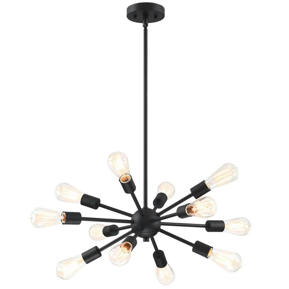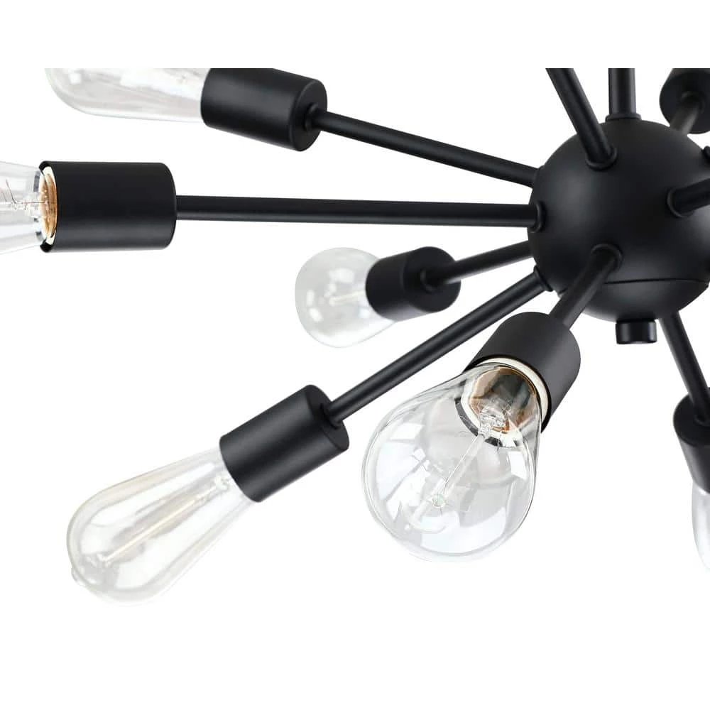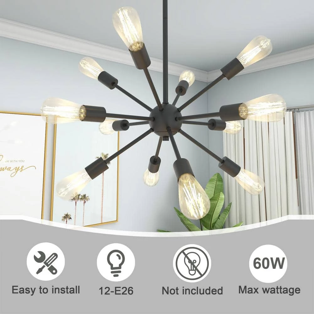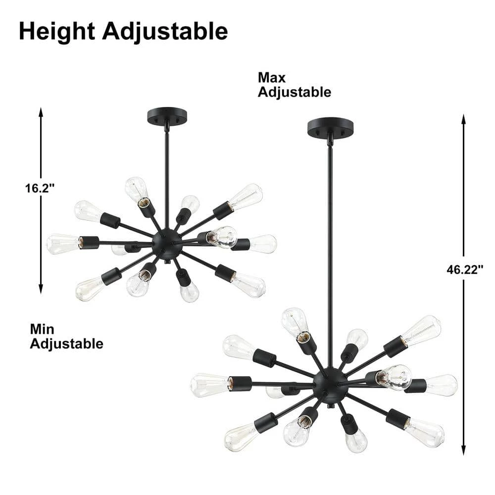 The 12 light chandelier fixture adopts the simple iron style and artificial satellite shape design. At the same time, the style you want to display can be determined by the selected light bulb. It will update your home with its retro or modern and eye-catching design. It crafted from high-quality metal in a polished finish, this beautiful hanging light with a minimal aesthetic, midcentury combines with modern dining room chandelier design with minimal sputnik shape, its warm and welcoming glow will dress up your kitchen island, dining room, hallway, living room, stairs and any living or commercial space. You can adjust the hanging height according to your needs, in addition, it can be installed on sloped or parallel ceilings.