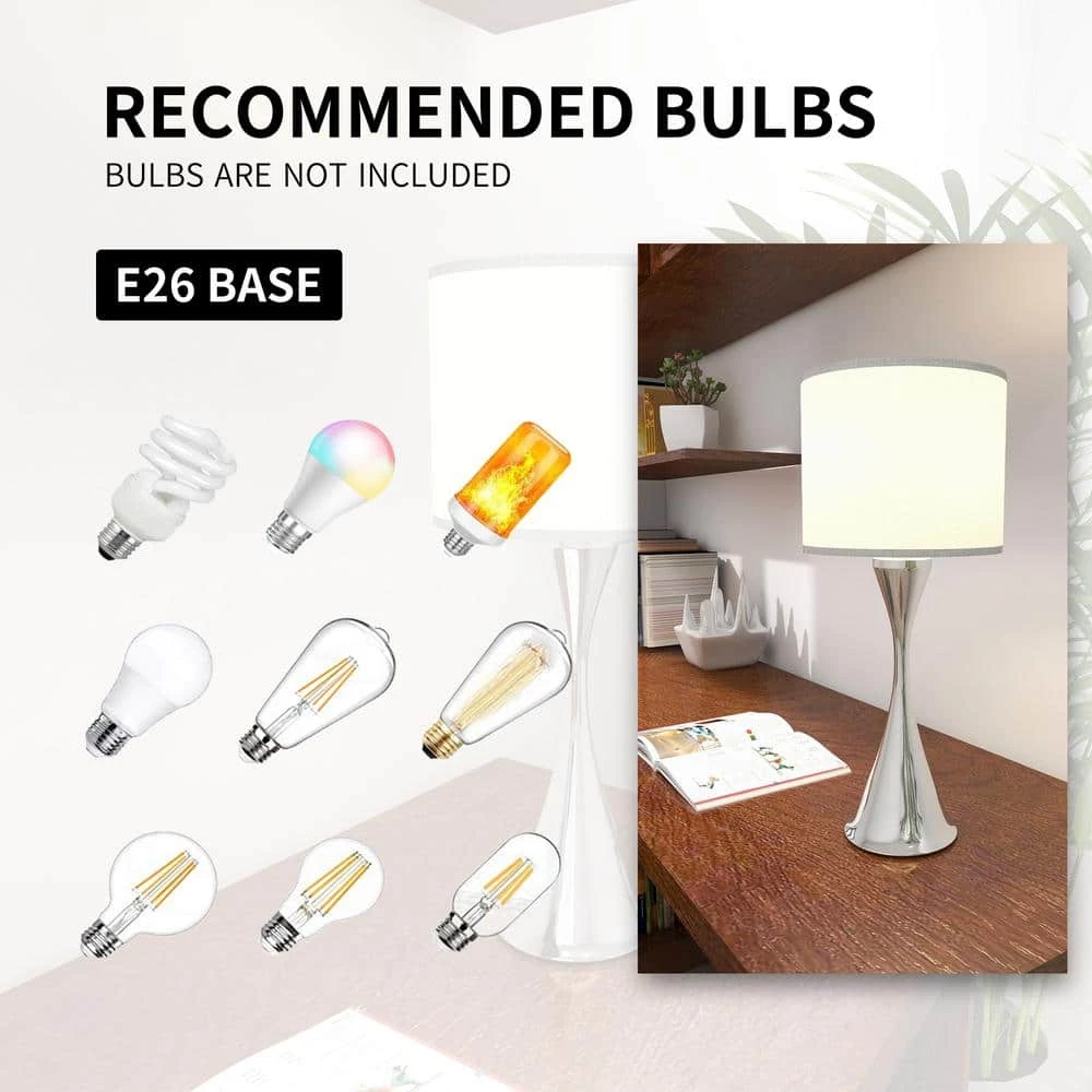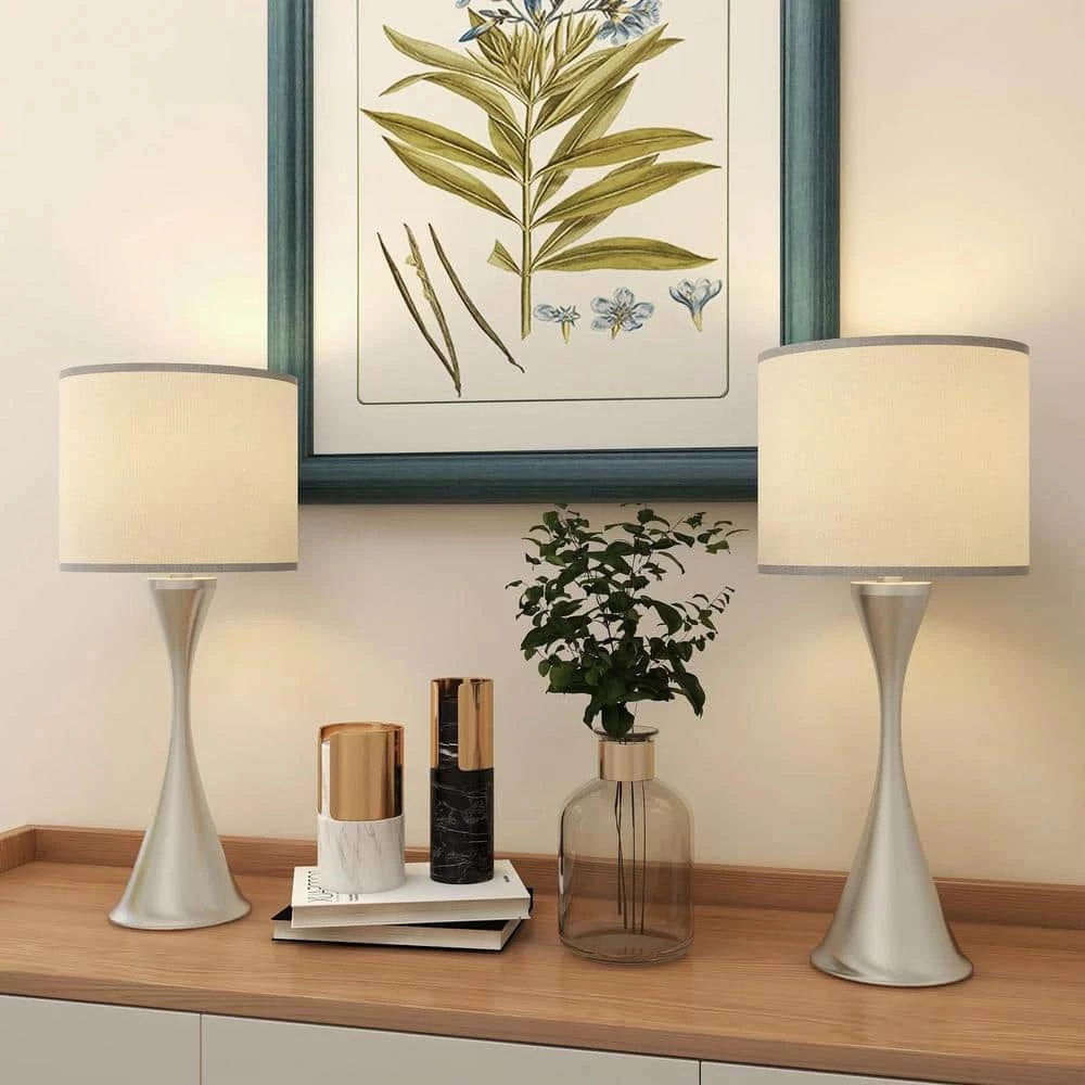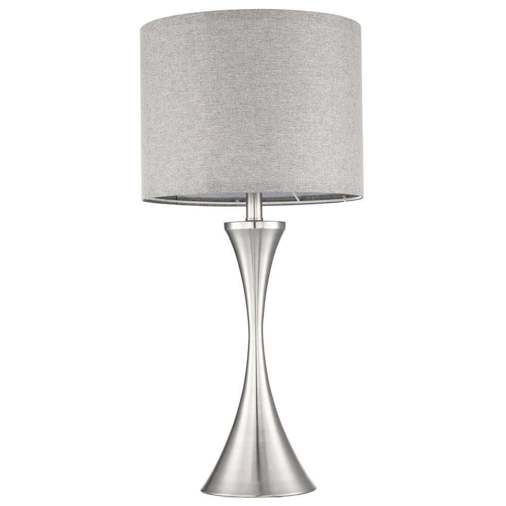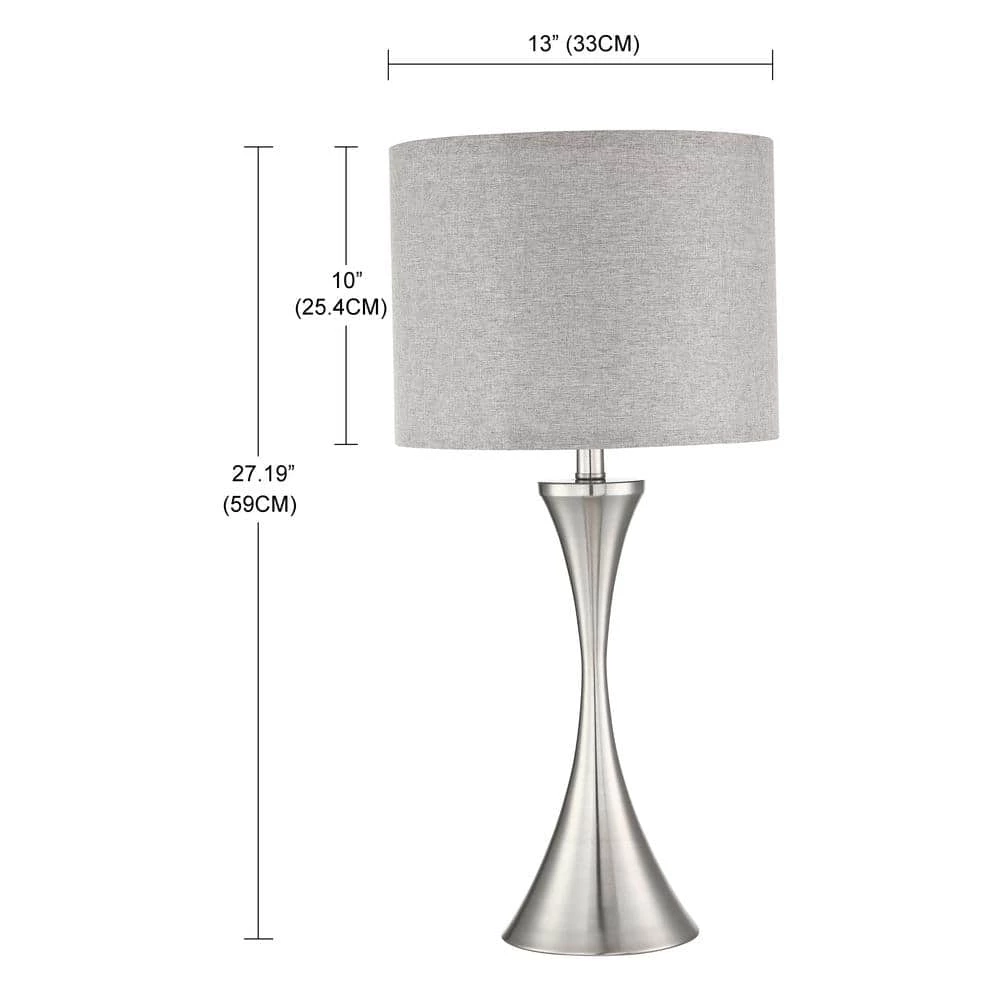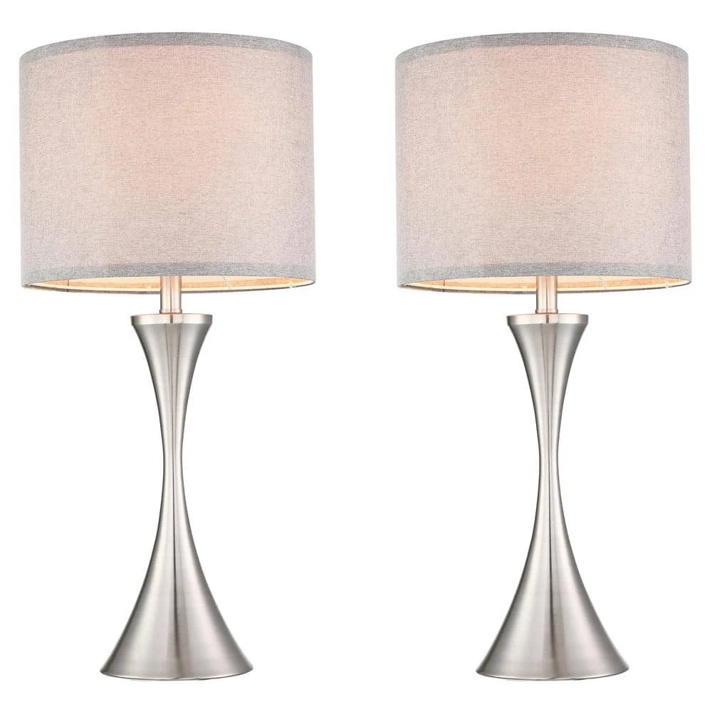 This contemporary table lamp set showcases an eye-catching hourglass figure with a dramatic flaring bottom half, all in a beautiful brushed nickel finish. Topped by drum shades wrapped in elegant grey textured linen fabric, this table lamp set will add a dash of modern style to any room. Whether resting on your nightstands, set on a side table in the den or tucked into your favorite reading nook, this lamp is a chic addition to any aesthetic. Set of 2 lamps, each is 27 in. tall. Round bases are 6.5 in. W. Drum shades are 13 in. W and 10 in. tall.