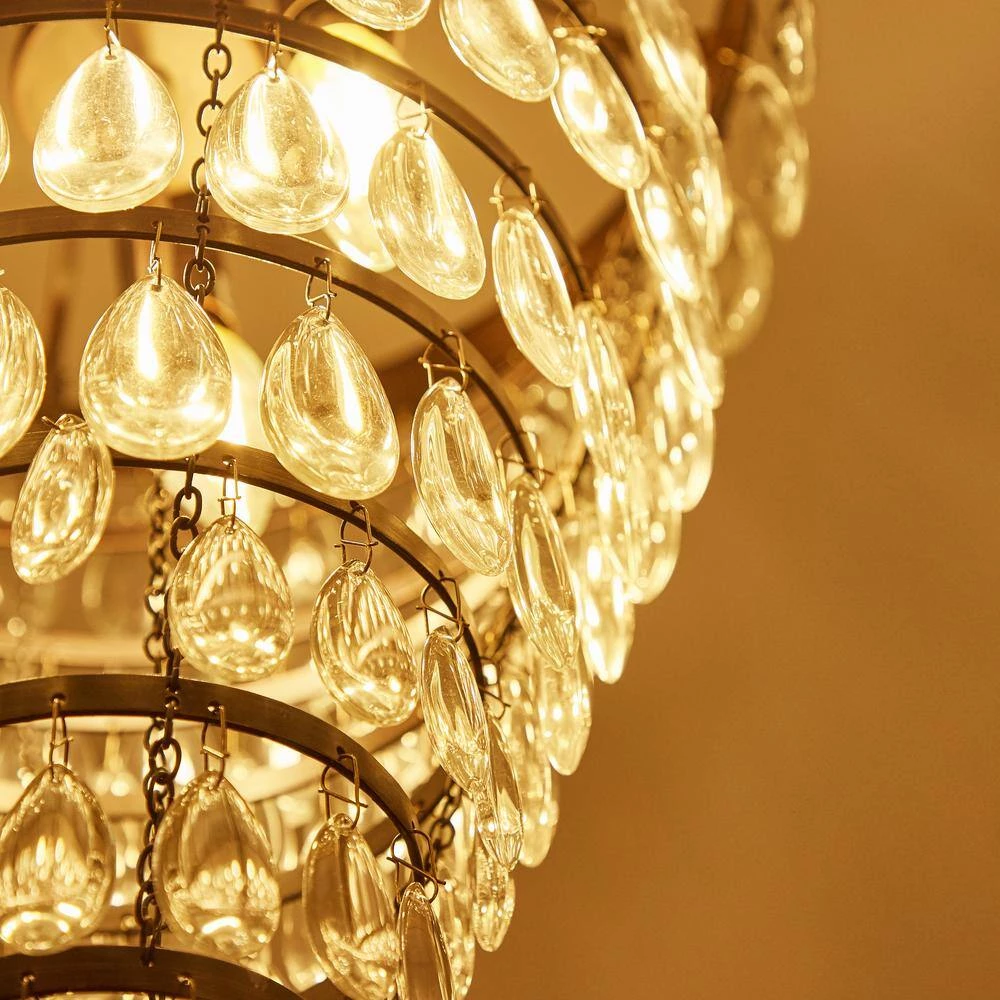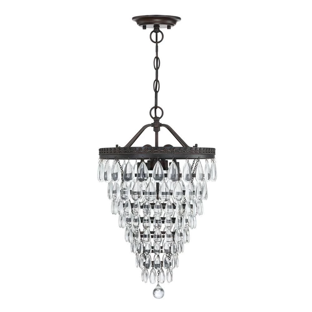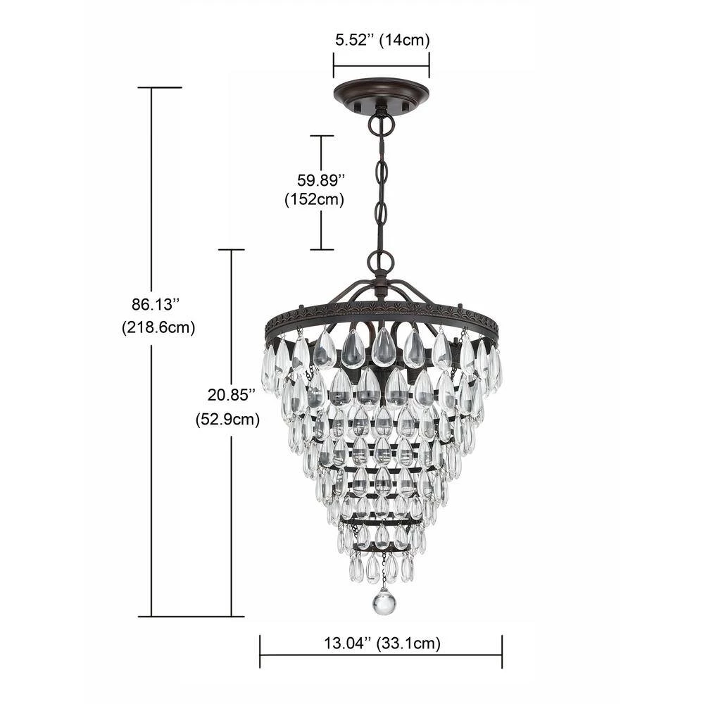 This unique beautifully opulent chandelier is the picture of contemporary perfection. It features oil rubbed bronze (ORB) hardware in a crystal beaded drum shade. 2-layers of cascading crystals drip from the hardware that supports its 3 downward-facing bulbs. The chain is 59.89 in and can be shortened to adjust to your hanging specifications.