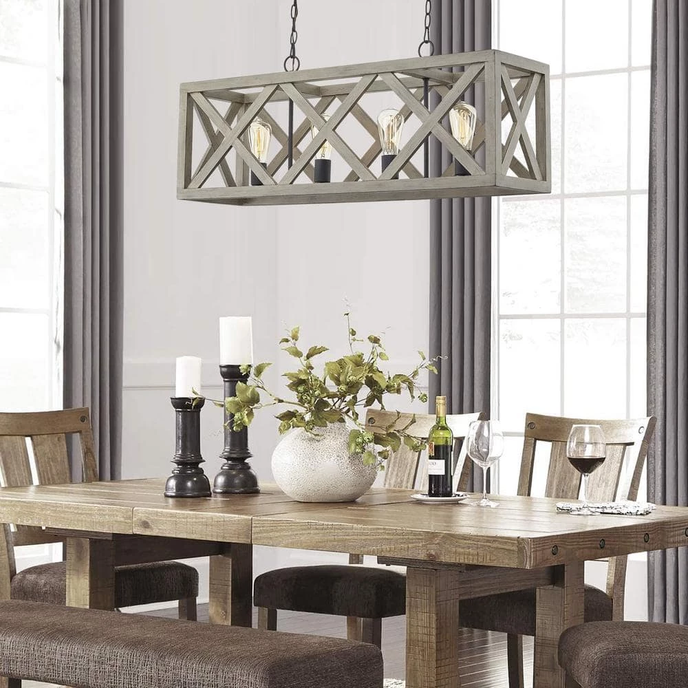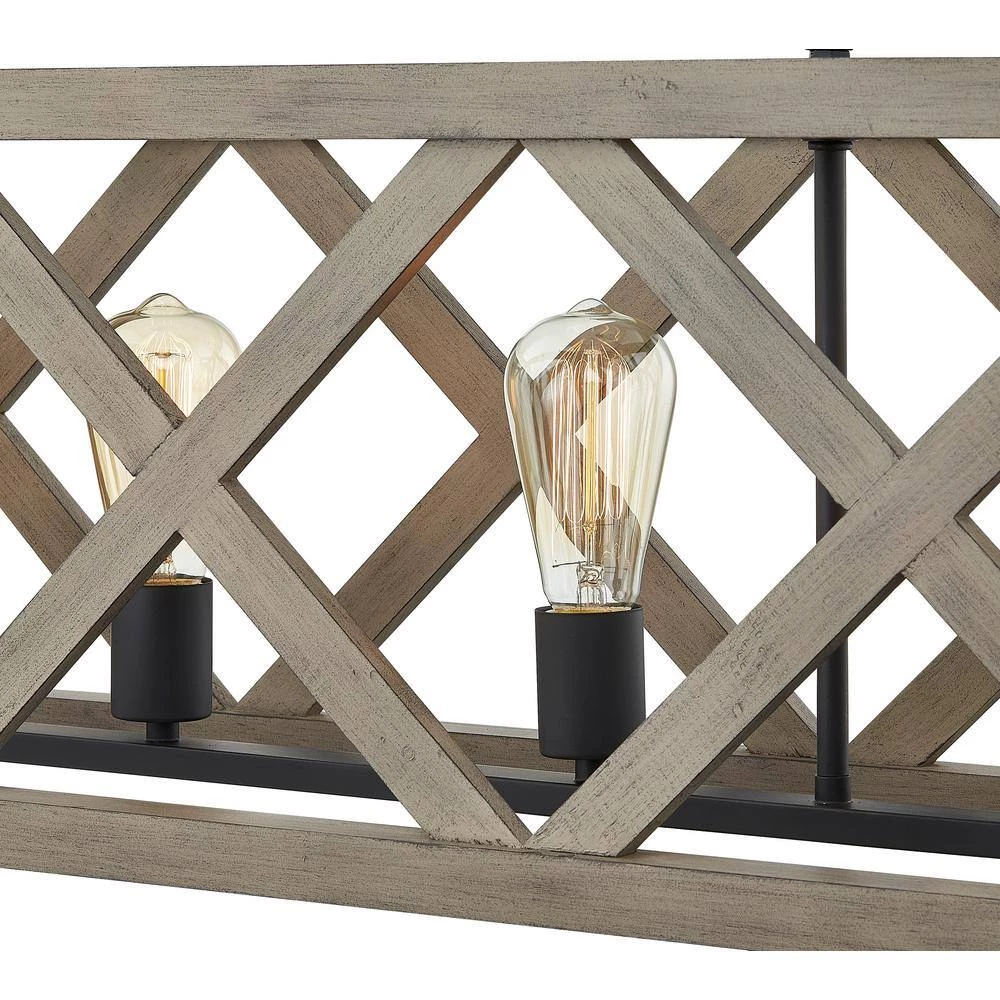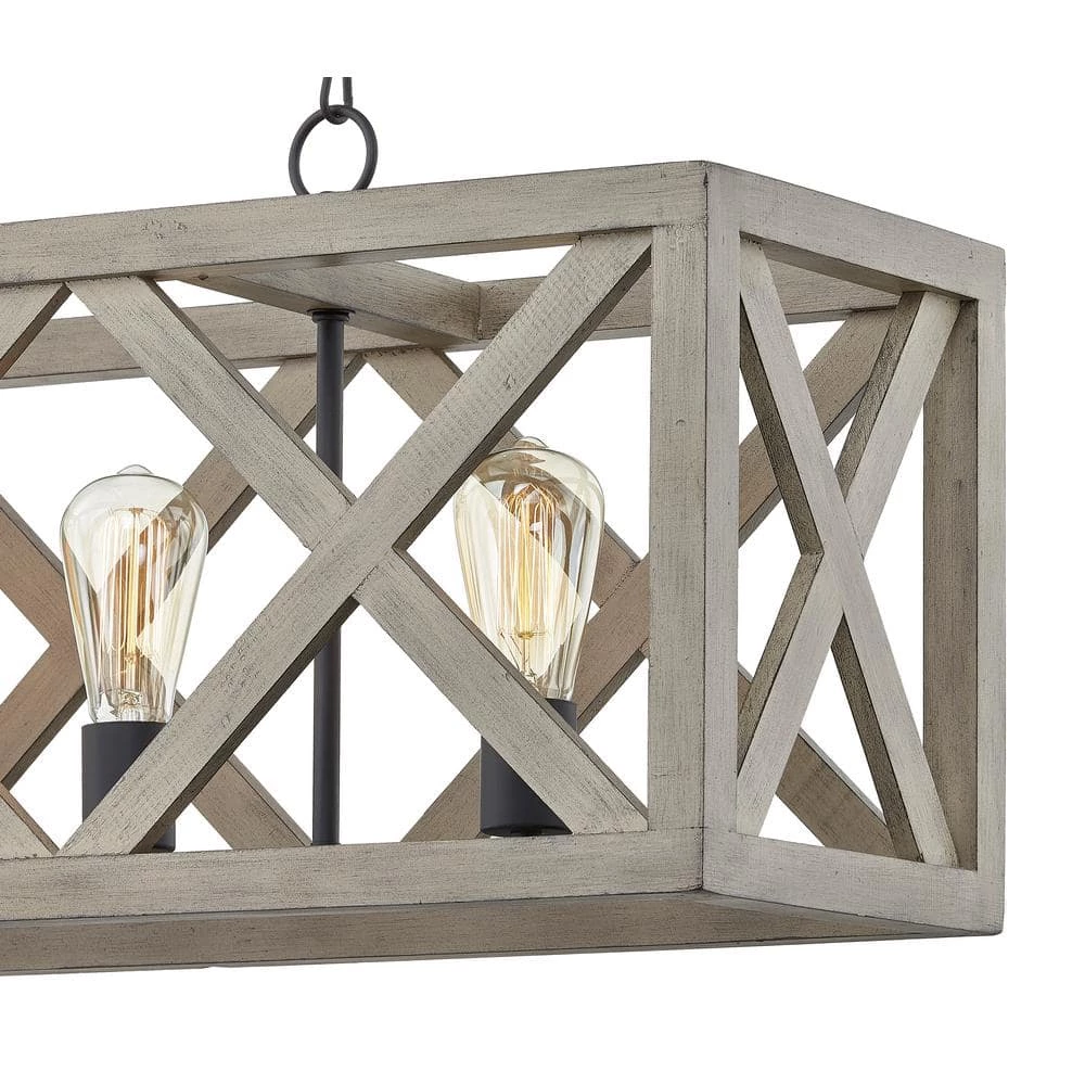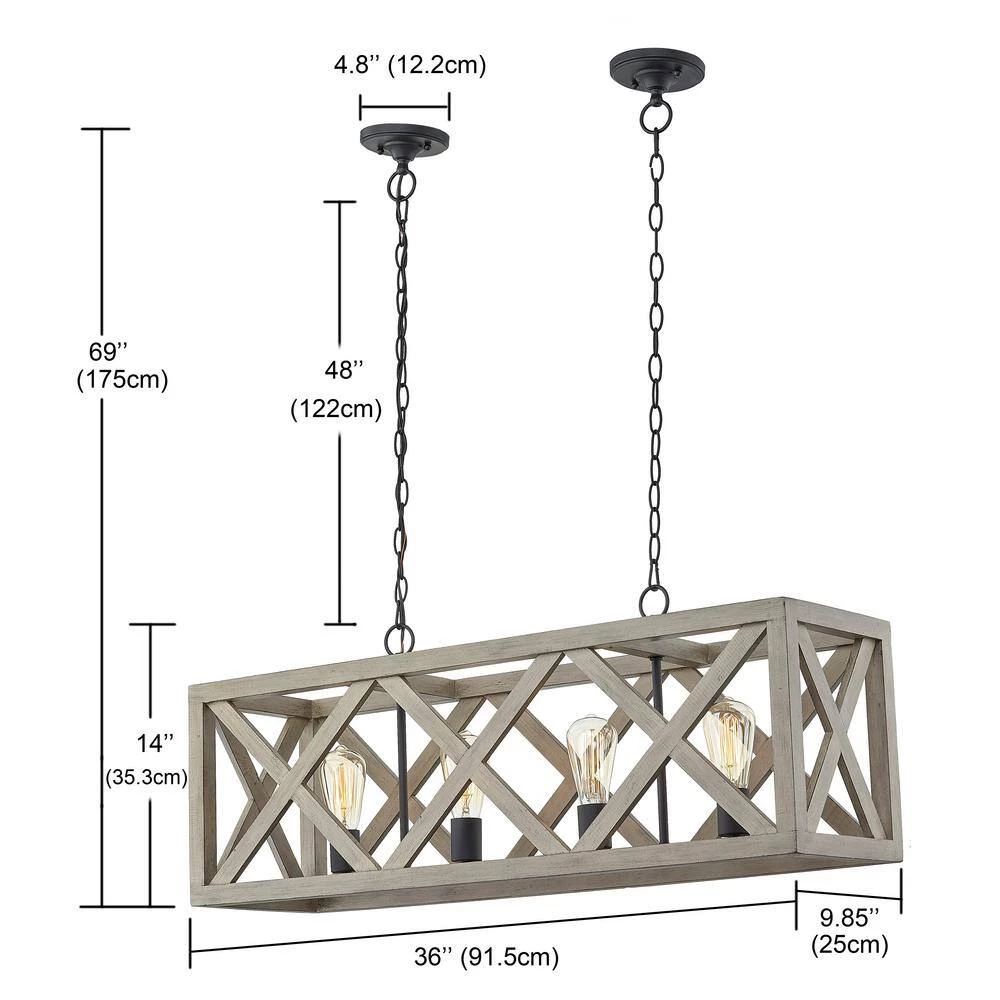 With steel construction and anchor gray oak finish, this contemporary island chandelier is a stylish addition over a kitchen counter or dining table. The cuboid shape displays diagonal crossing lines that add a geometrix pattern on the open frame. Use 4 vintage Edison style bulbs (not included) for a warm vintage look.
