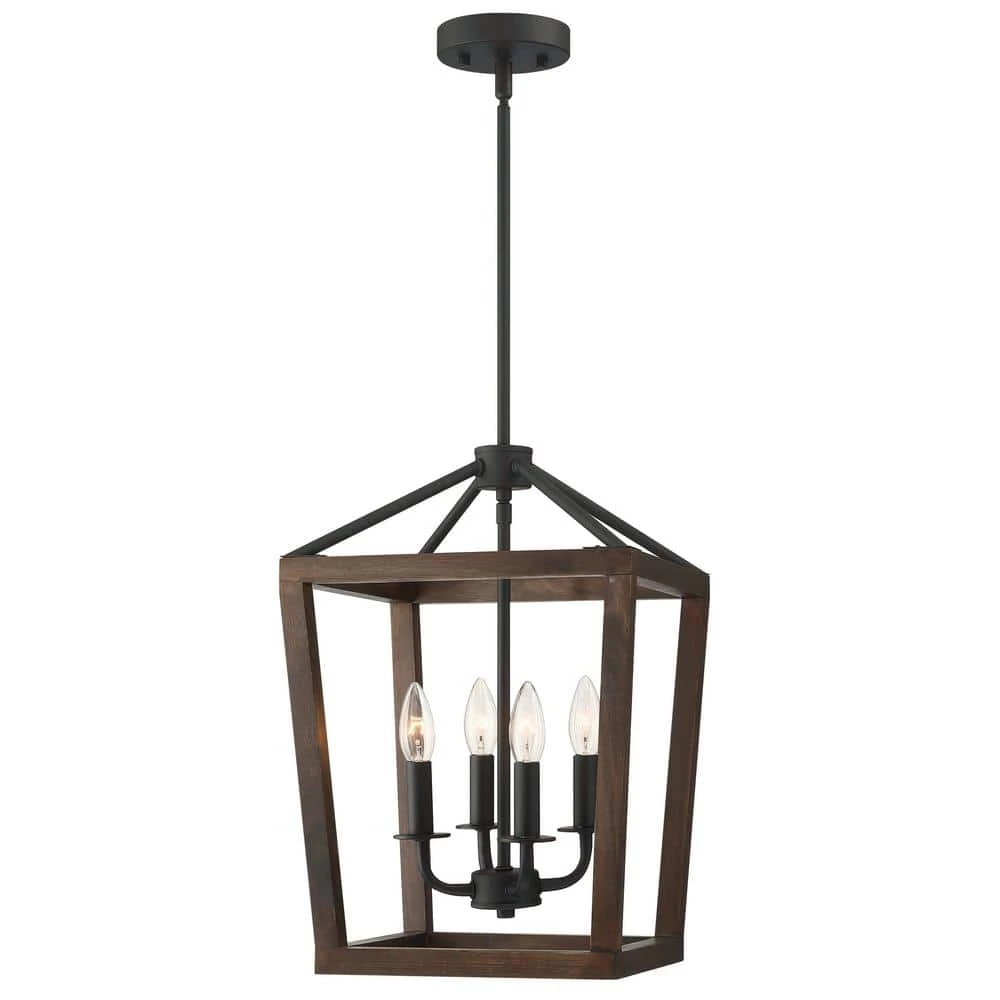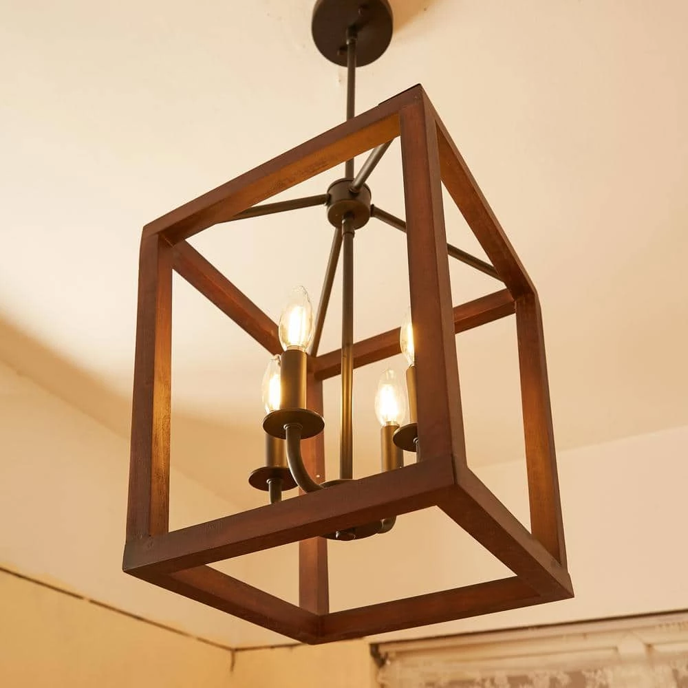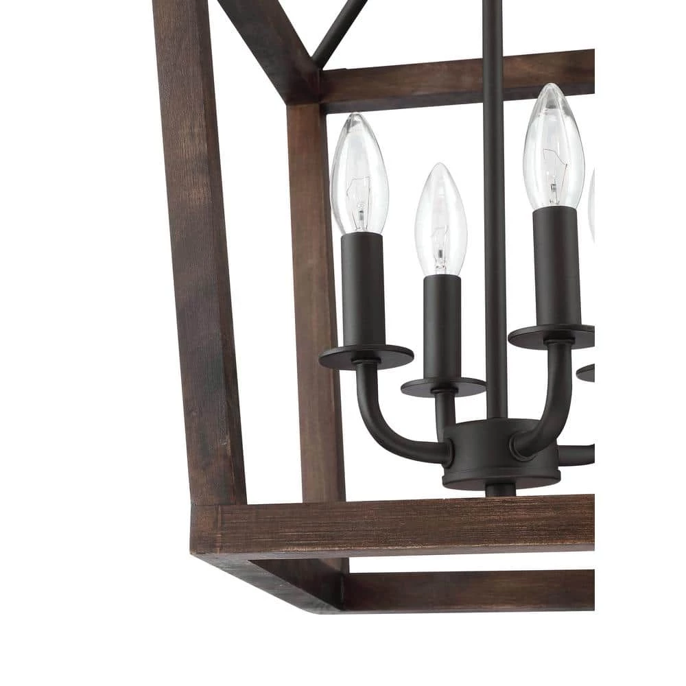 This classic 4-Light pendant light features a metal and oak caged frame of negative space with exposed bulbs that illuminate from within the center. The shape of the fixture is inspired by iconic street oil lanterns. The pendant light suspends from a chain link that is adjustable to allow the fixture to hang in different height from your ceiling.