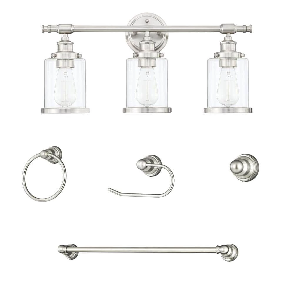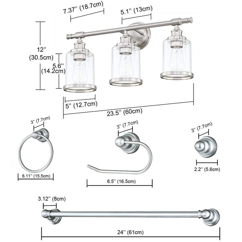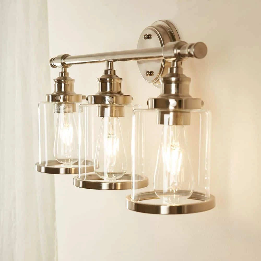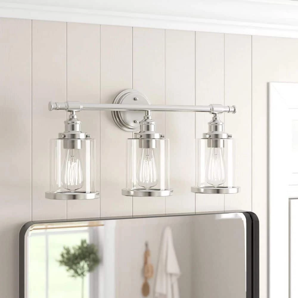 This bathroom vanity light fixture offers smooth lines with a modern design. The protective brushed nickel finish provides a unique look to this light fixture. The clear glass shades provide clean illumination. These bath fixtures are built from steel to last for-years to come and are designed for damp locations. These light fixtures come with everything you need for easy installation with the shade in the up or down position. This bathroom lighting vanity uses 3 screw based light bulbs up to 60-Watt each.