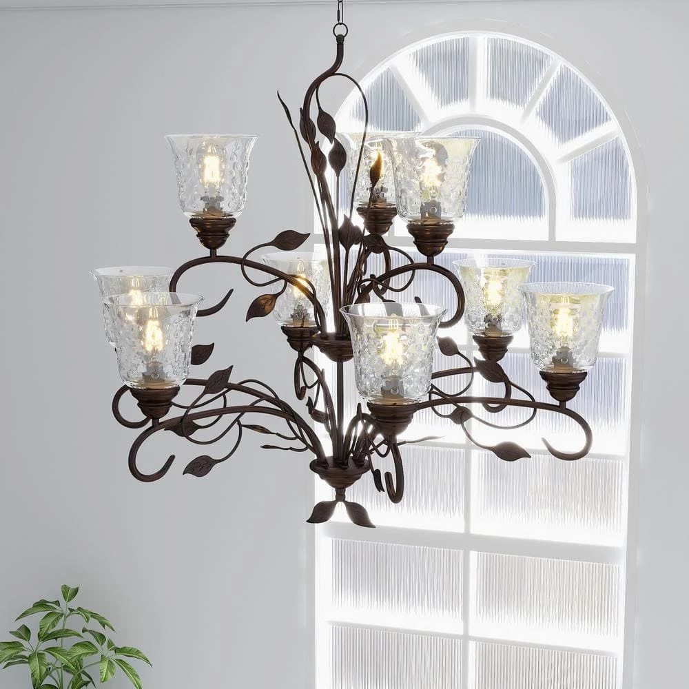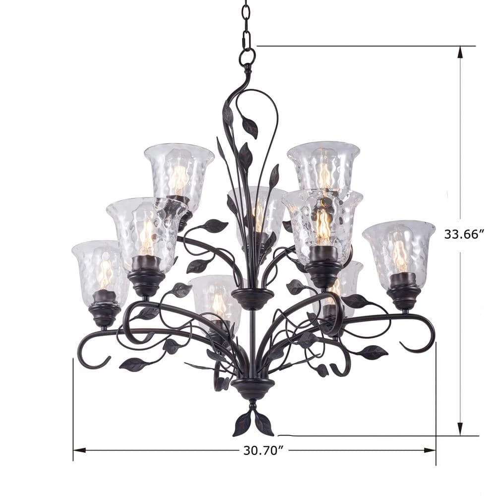 This nine-light black chandelier is an elegant Gothic-inspired lamp. The metal is painted black and the design features shiny crystals as leaves. This light fixture is versatile in style for you and your family to definitely enjoy. A unique blend of aesthetics and functionality, this chandelier sets a lovely mood in your home. This chandelier should be used in dry areas. Whether used in the dining room, entryway, or kitchen, the light fixture will evoke a sense of modern sophistication to your home.