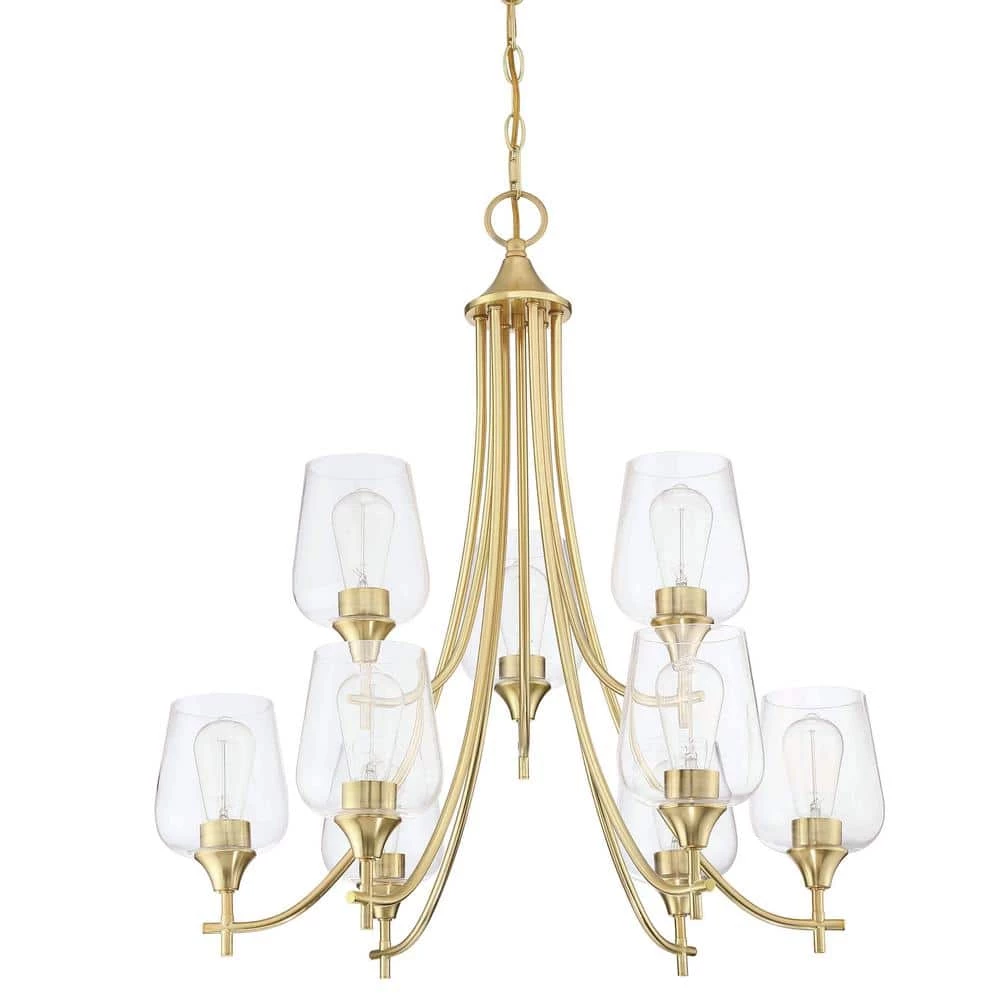 - Modern style: 5-light chandelier features white clear glass shades with a stylish accent strip, aged brass finish, and adjustable hanging height, add sophistication and style to your home with this beautiful ceiling hanging light fixture