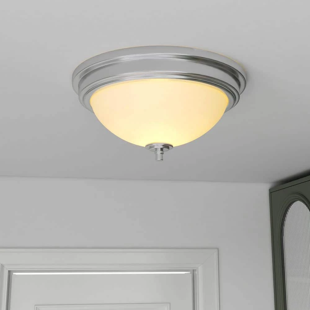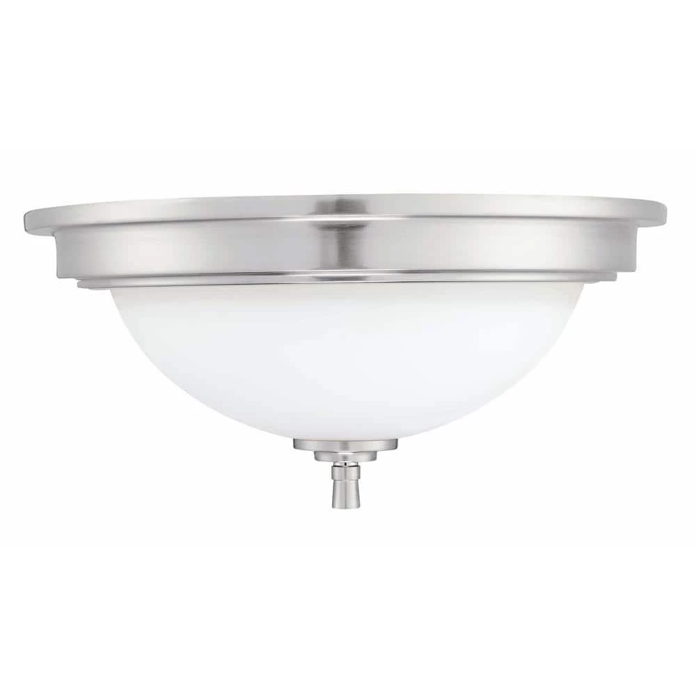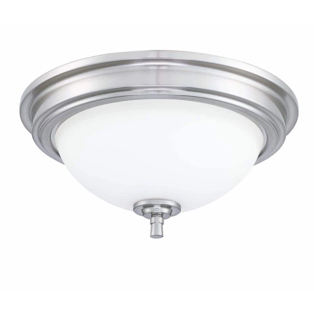 Simplistically stylish, this understated flush mount will boost the brightness in any room inside your home. 2-light flush mount with dome shaped glass, solid trim and decorative knobs. The Flush Mount is a beautiful look at a great value. From the professional to the do-it-yourselfer, finished in Brushed Nickel with frosted white glass. Uses 2 60-Watt medium-base light bulbs. From kitchen to bath or any room in between, this versatile flushmount will add value to your home at a value price.