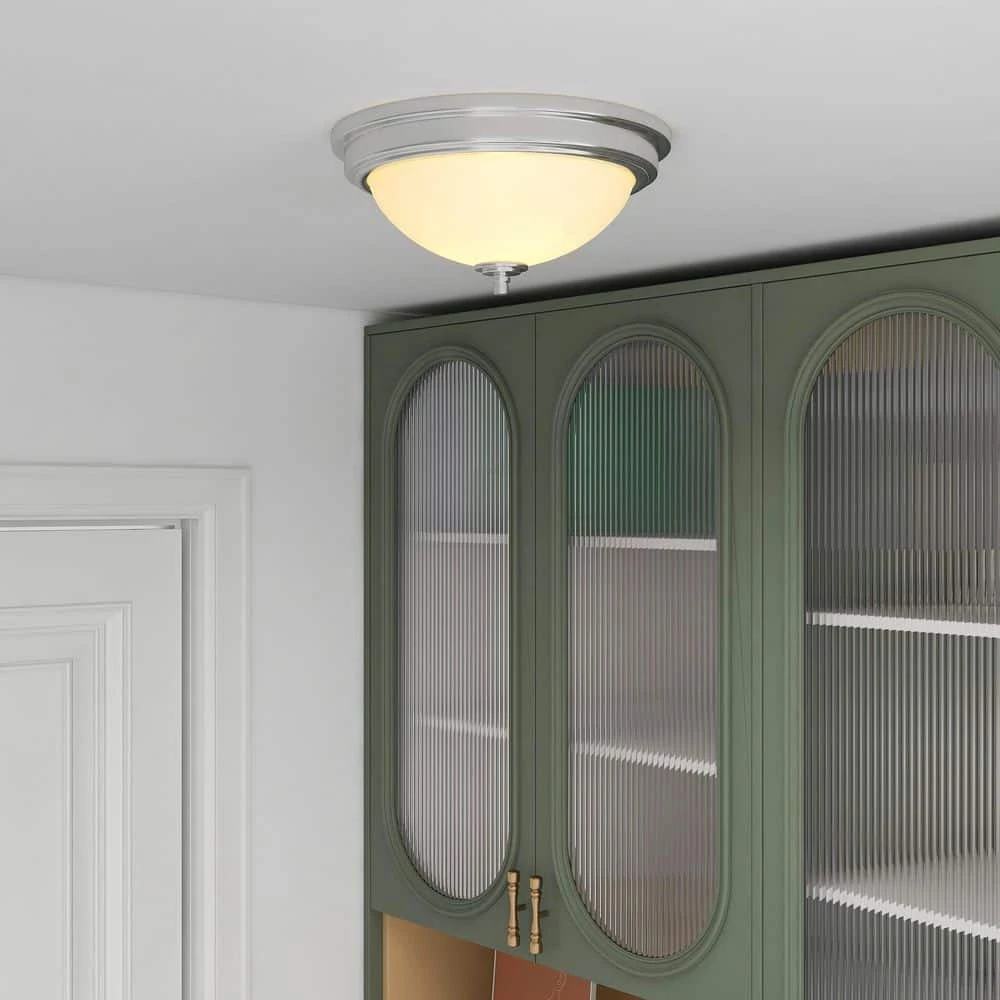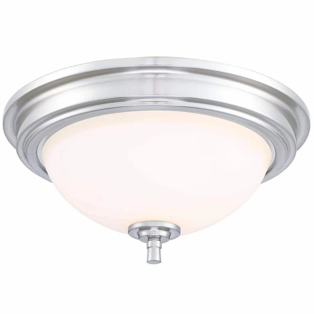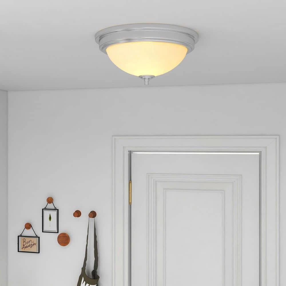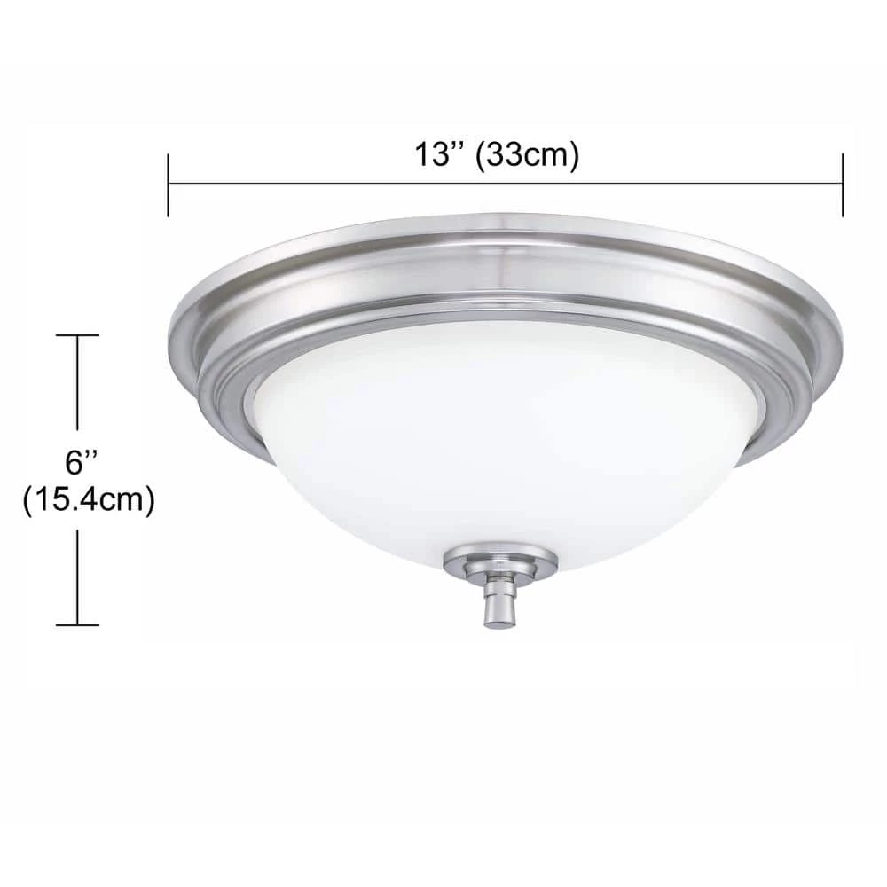 Simplistically stylish, this understated flush mount will boost the brightness in any room inside your home. 2-light flush mount with dome shaped glass, solid trim and decorative knobs. The Flush Mount is a beautiful look at a great value. From the professional to the do-it-yourselfer, finished in Brushed Nickel with frosted white glass. Uses 2 60-Watt medium-base light bulbs. From kitchen to bath or any room in between, this versatile flushmount will add value to your home at a value price.