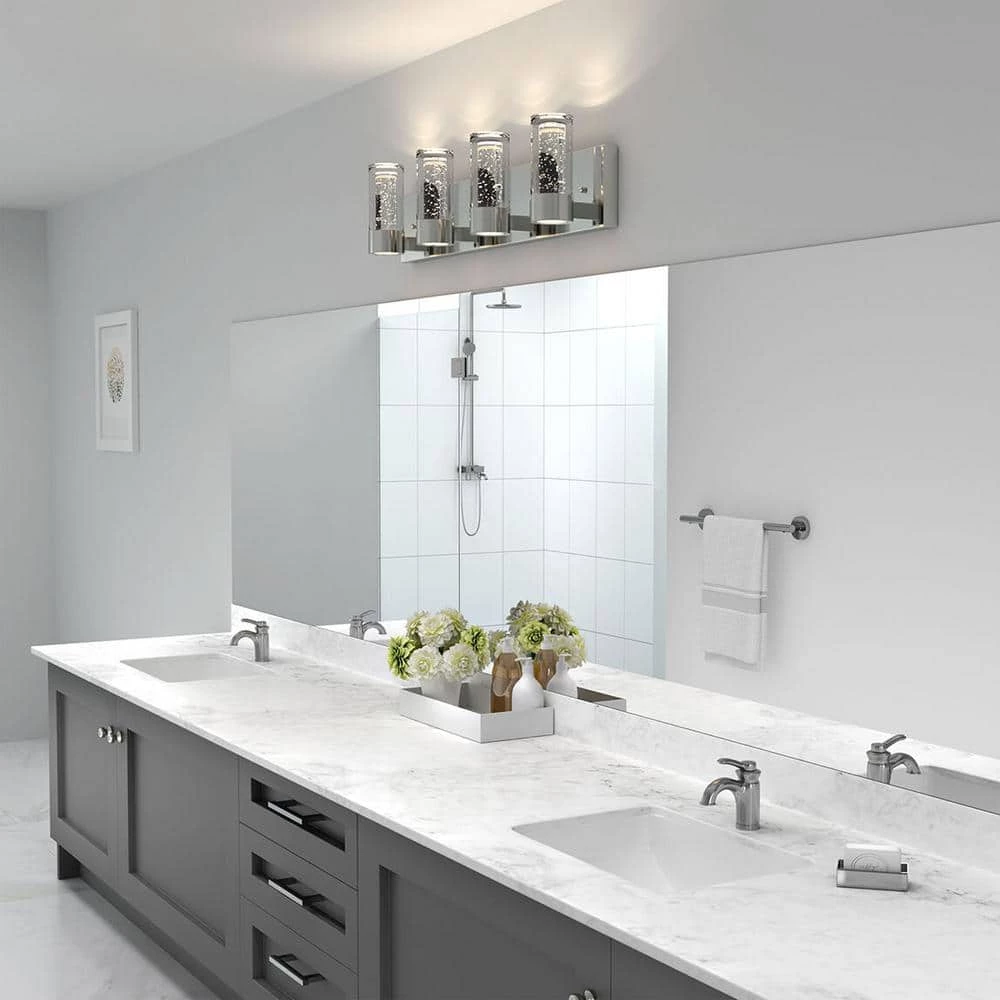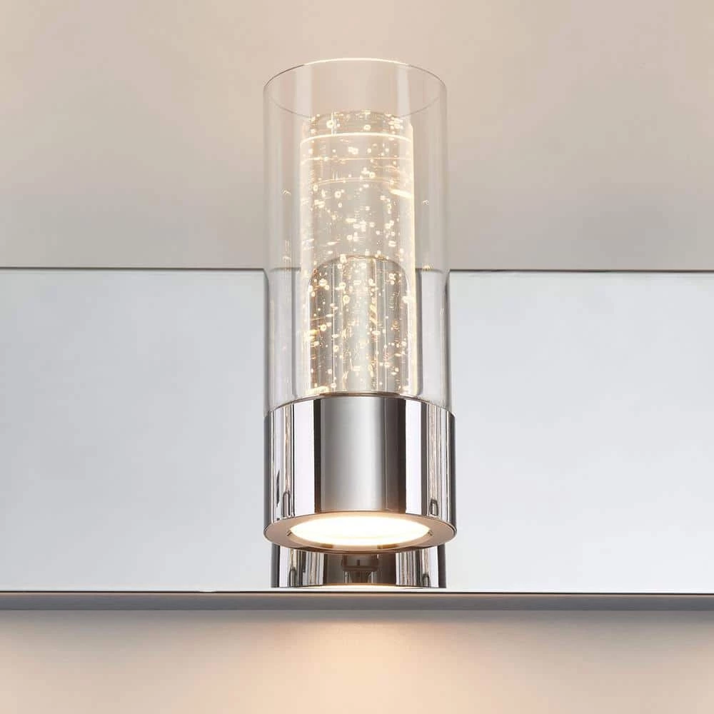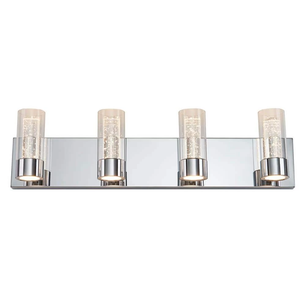 Give your interior a high-class look with the luxurious ratio 4 light fixture. With its 4 wide cylindrical shades made of transparent glass and enhanced with unique shiny bubbles, this mural applique is sure to give your home a sparkle. Your bathroom, bedroom and lobby are just some of the spaces that would benefit from this dazzling piece. The chrome frame and sumptuous flair of this model are also sure to bring incredible character to your decor. The ratio 4 isn’t only elegant, it also provides you with a lot of flexibility. By combining it with a dimmer, you can easily master all types of interior atmospheres. Affix it to a wall to discover how much this mural lighting fixture can enhance your interior.