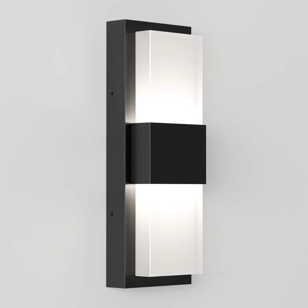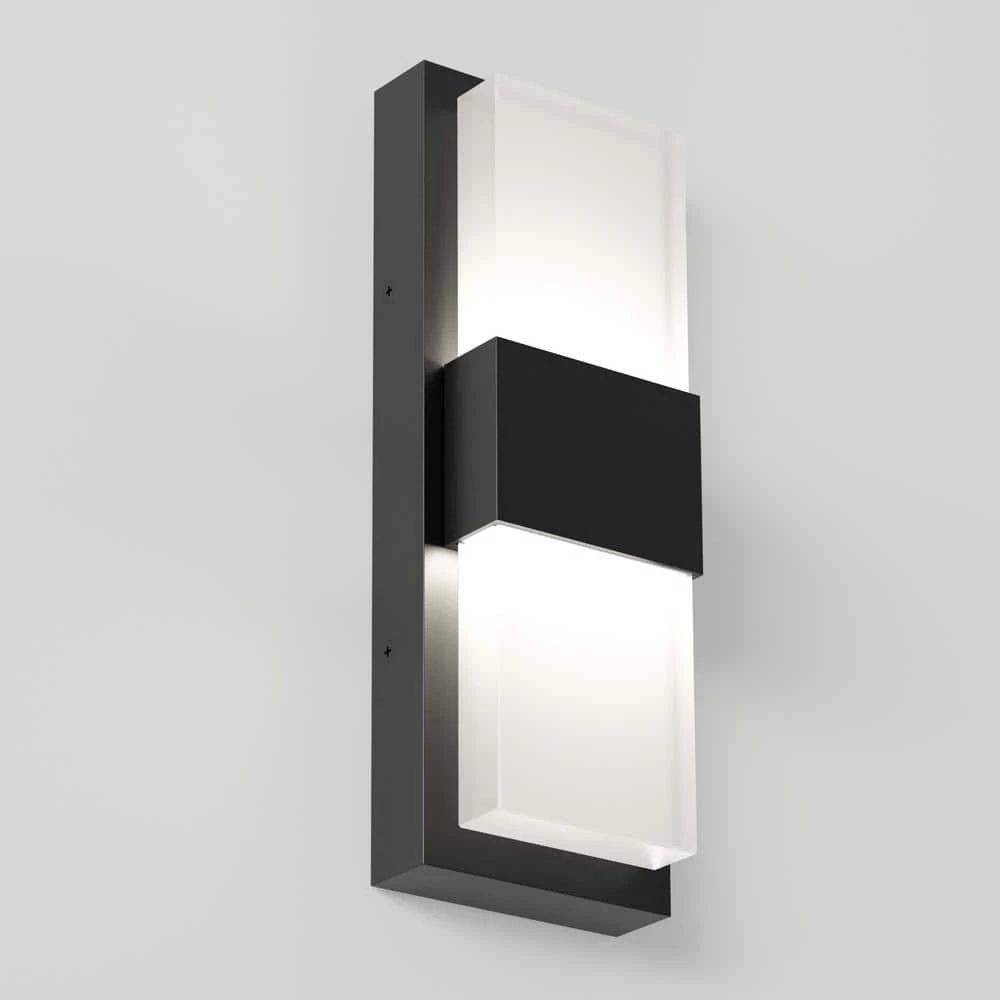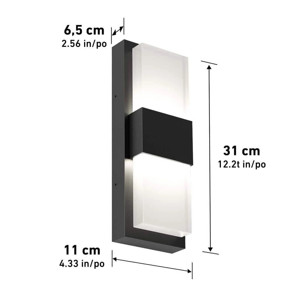 Use this LED wall sconce to illuminate your exterior front door or a work of art hanging on your living room wall. The contemporary style with its frosted glass diffuser also brings soft light to an alcove in your bedroom or any other space in your home. Weather-resistant, this fixture can be installed indoors and outdoors, it offers 450 Lumens of soft white light (3000K), has a lifespan of 50,000-hours and is compatible with most LED dimmers. Height: 12 in. (31 cm), width: 4.33 in. (11 cm).