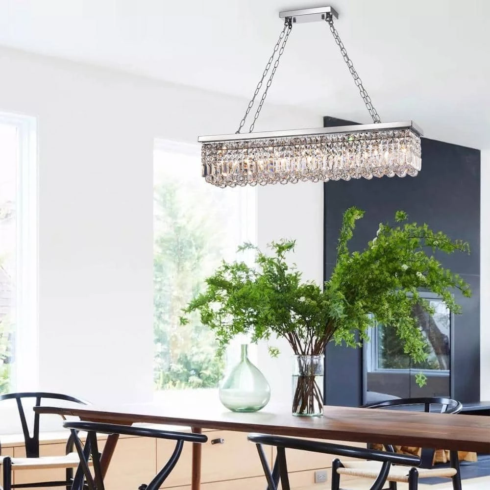 This Contemporary Chandelier comes in a Chrome finish with clear glass. This 39.4 in. Chandelier brings a modern appearance with constructed clean lines to complement the decor in any room of your home. It would be a perfect choice.